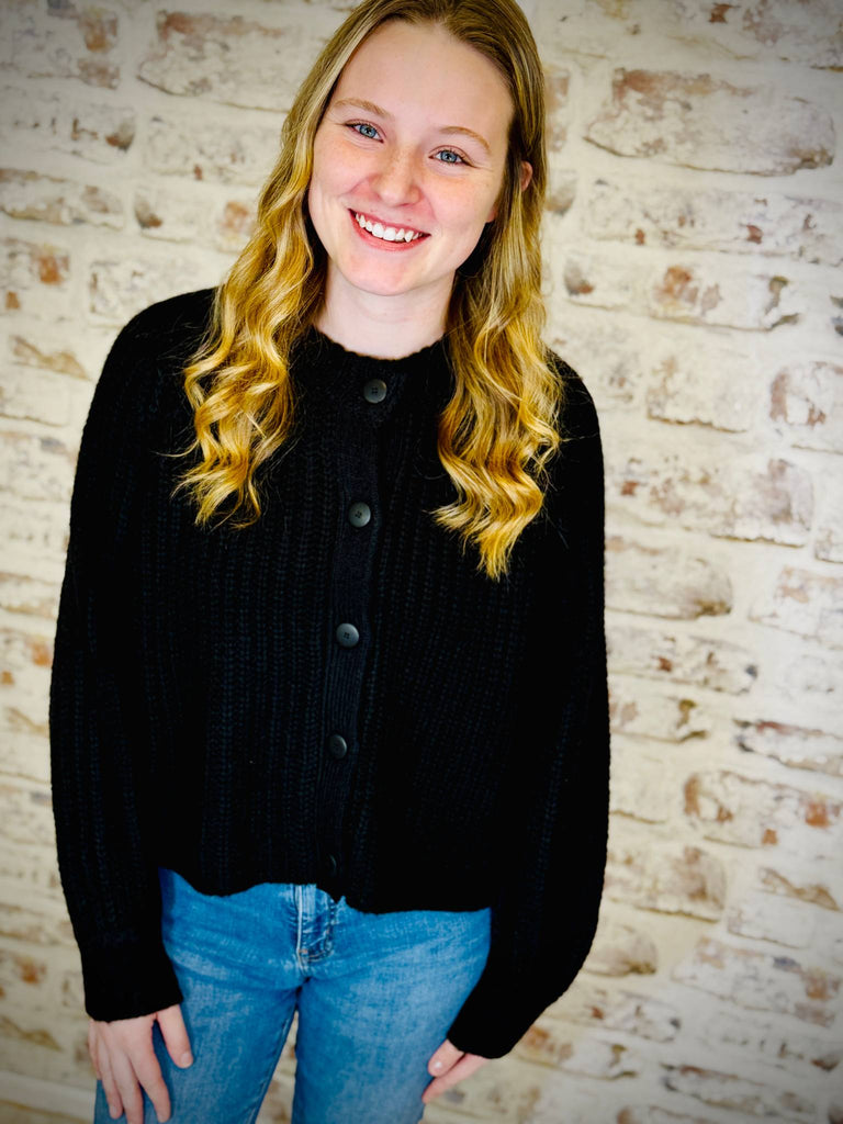 This black button up cardigan is sure to get a lot of use! With its high neck style and it sits right at the hip, it's on-trend and it's going to keep you warm and cozy!