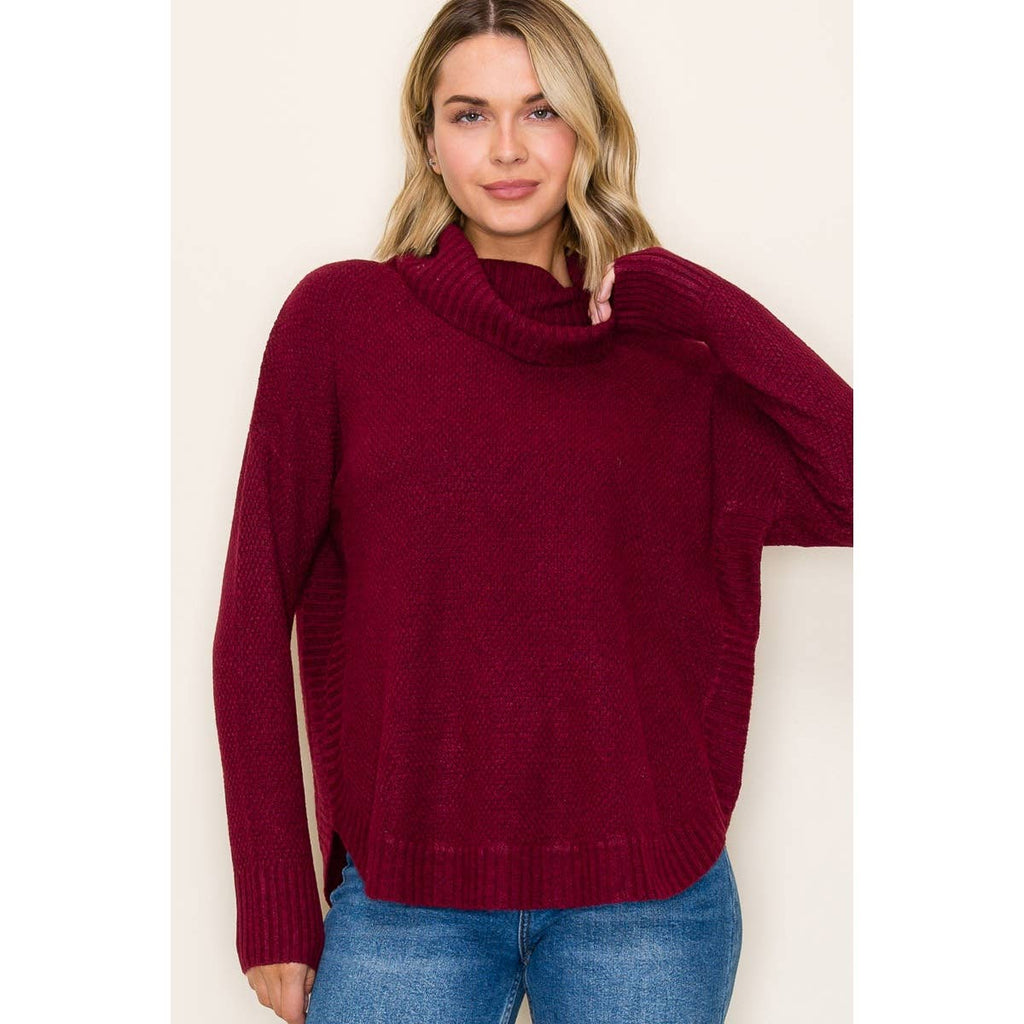 Get cozy and cute with this slouchy turtleneck waffle sweater top! Featuring a fun waffle texture and a tulip hem that adds a playful twist, this pullover sweater hugs you with long sleeves perfect for chilly days. The rich burgundy color brings warmth and charm to any outfit, making it a favorite for casual days and cozy nights. Slip it on and enjoy comfort with a bit of stylish flair!