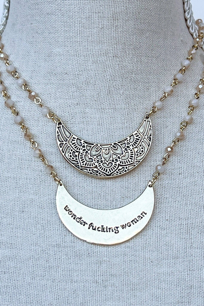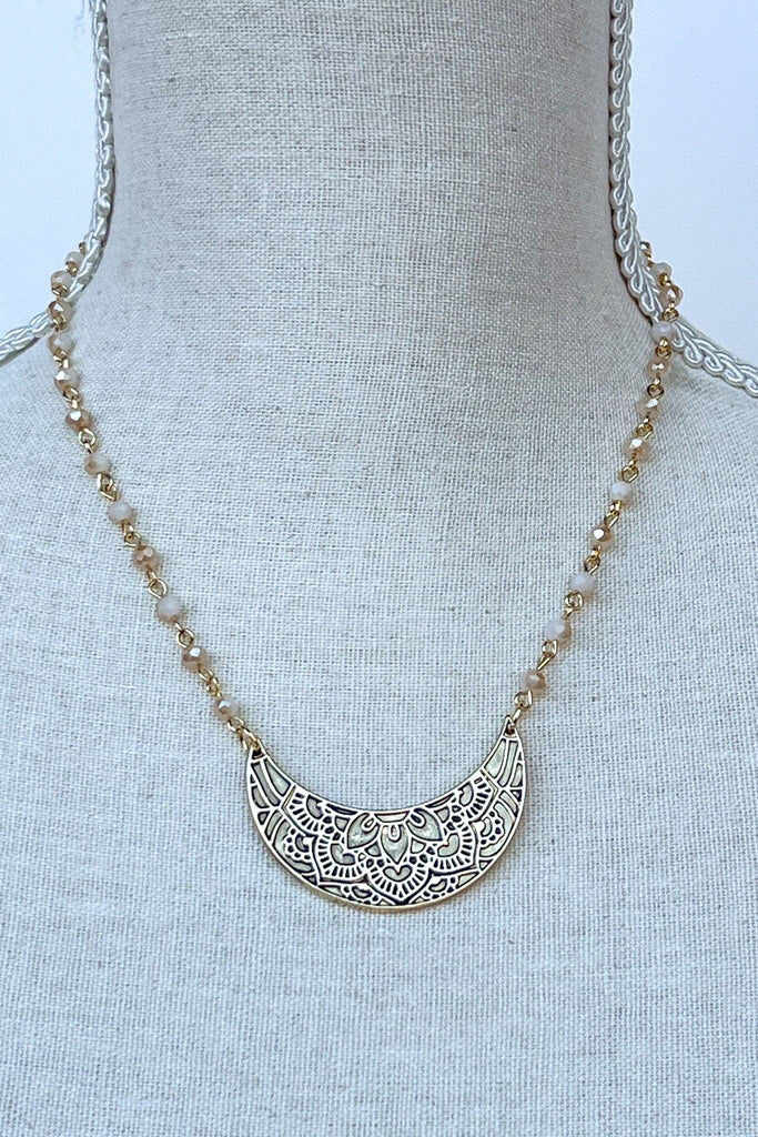 Single strand short chain link necklace with glass beads throughout the chain. Features a crescent shaped pendant with beautiful engraving on the front!