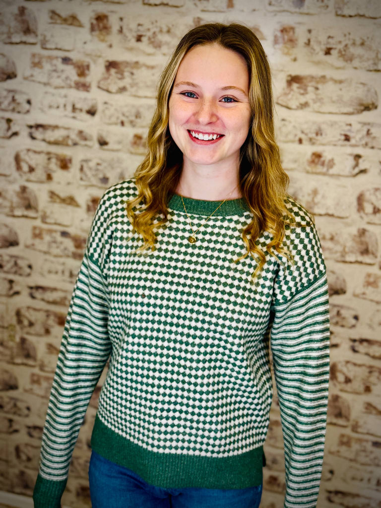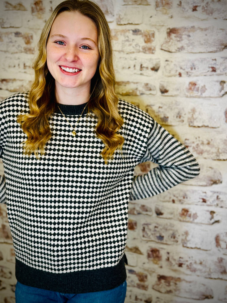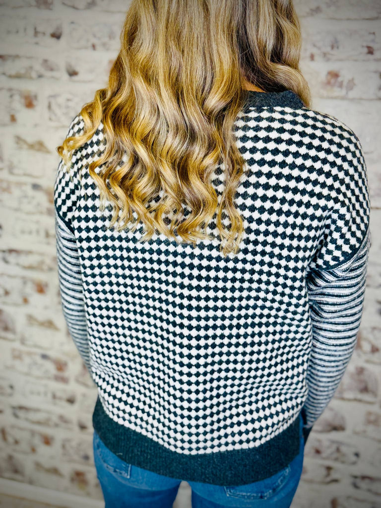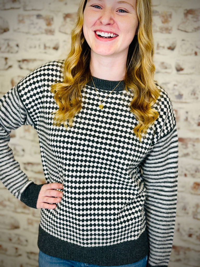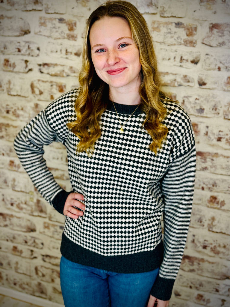Get ready to turn heads with this playful crew neck pullover sweater! Featuring bold checkerboard patterns and long striped sleeves, it brings a fun twist to cozy comfort. Perfect for layering on chilly days or adding flair to your casual look, this sweater is a quirky mix of classic and cool that keeps you stylish and snug all season long. Whether you’re out with friends or lounging at home, it’s your go-to piece for effortless charm.