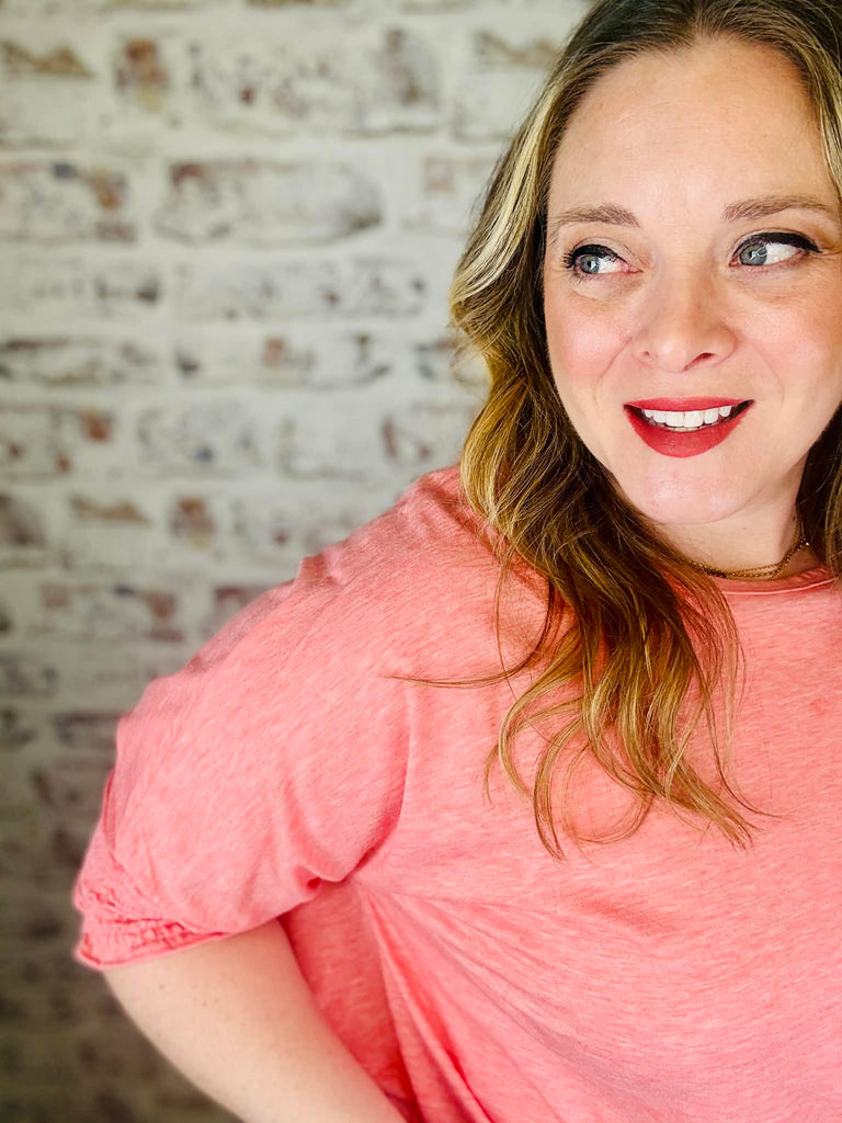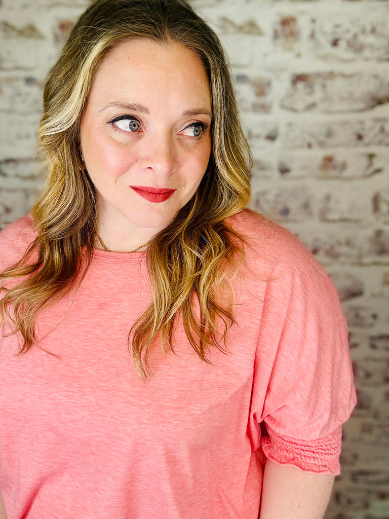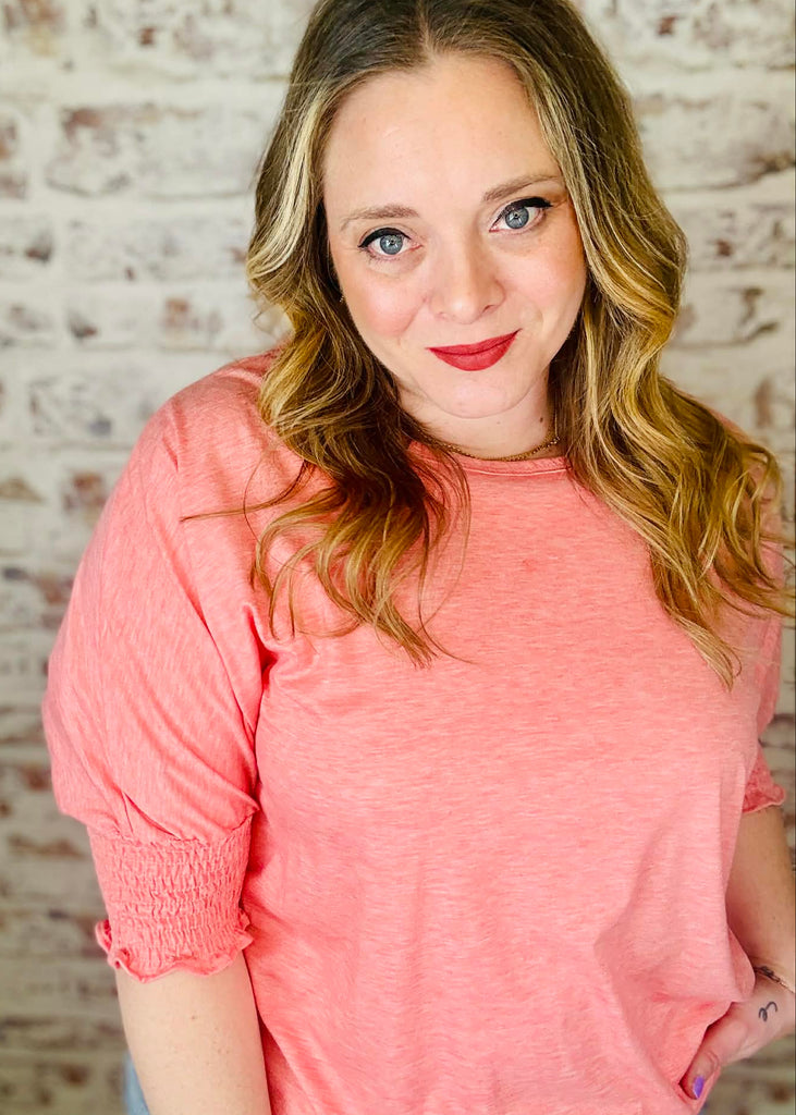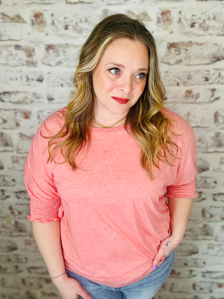 Slip into effortless comfort with this breezy long tee that's all about that relaxed vibe. The soft peach-pink hue brings warmth to any outfit, while the round neckline keeps things classic and easy. Those charming smocked sleeve cuffs at the elbow add just a touch of personality without trying too hard. Perfect for lounging, running errands, or whenever you want to feel put-together without the fuss.