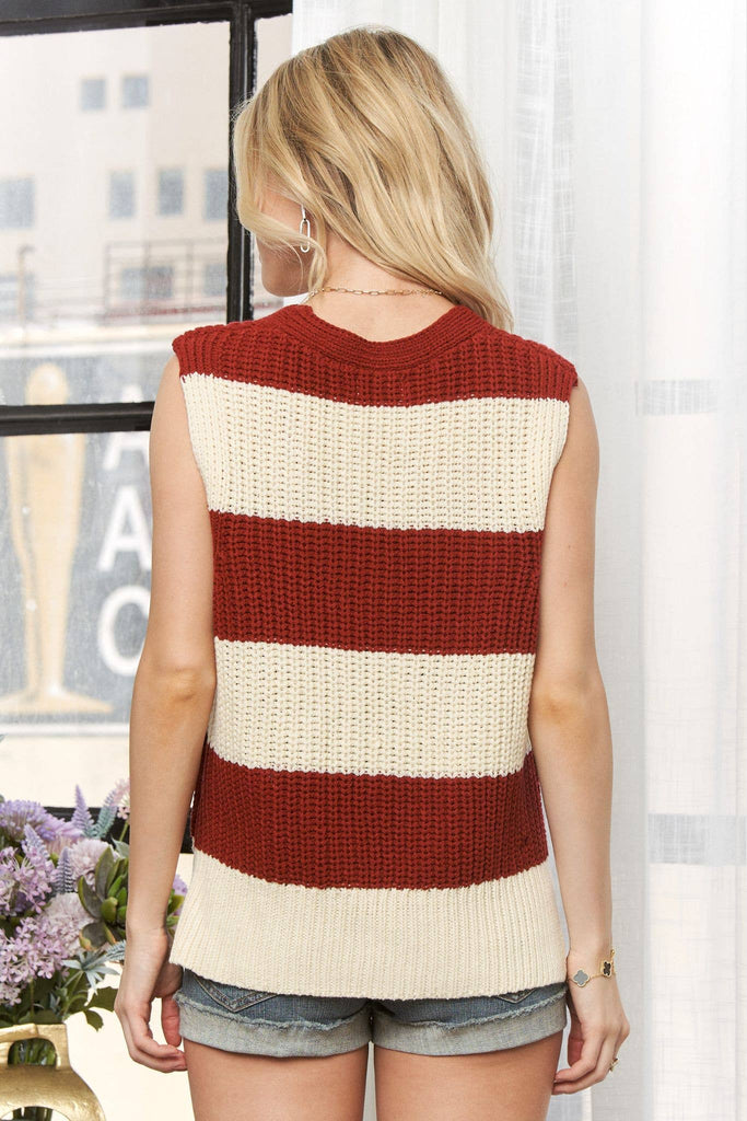 Layer this playful sleeveless knit sweater over your favorite tee for instant style. Featuring a flattering V-neck and eye-catching colorblock stripes in olive and ivory, it's the perfect lightweight piece for transitional weather. The soft knit fabric drapes beautifully while keeping you comfortable all day long. Note: actual colors may vary slightly from photos.