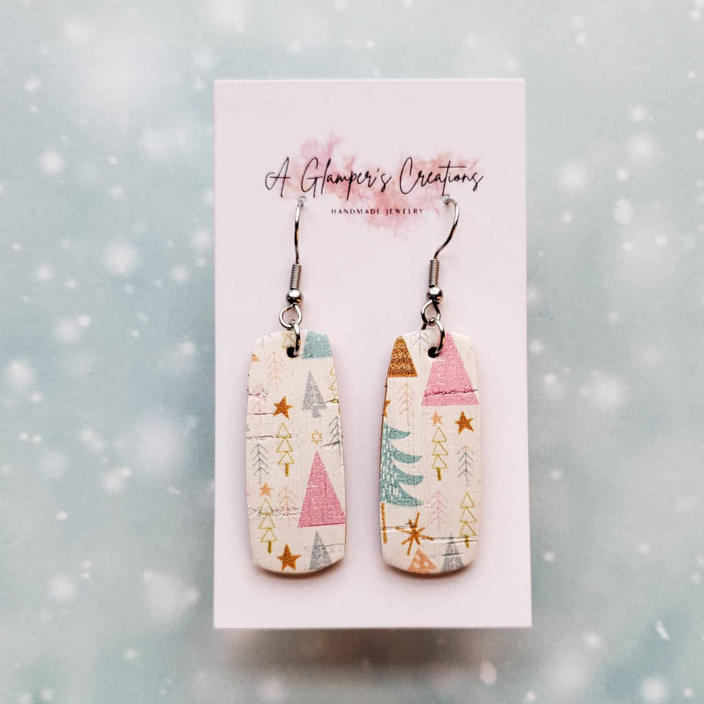 Pink & Teal Christmas Tree Mini Bar Leather Earrings Earrings are made of high quality cork backed with genuine leather. These are perfect for Christmas! Dimensions: approximately 1.5 inches Hooks are hypoallergenic stainless steel and come with rubber backings on an earring card.