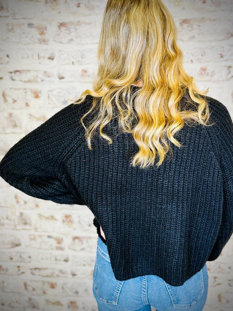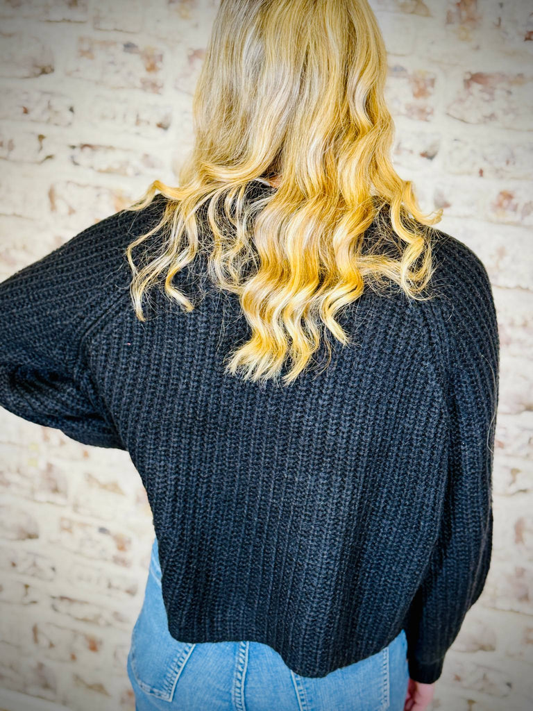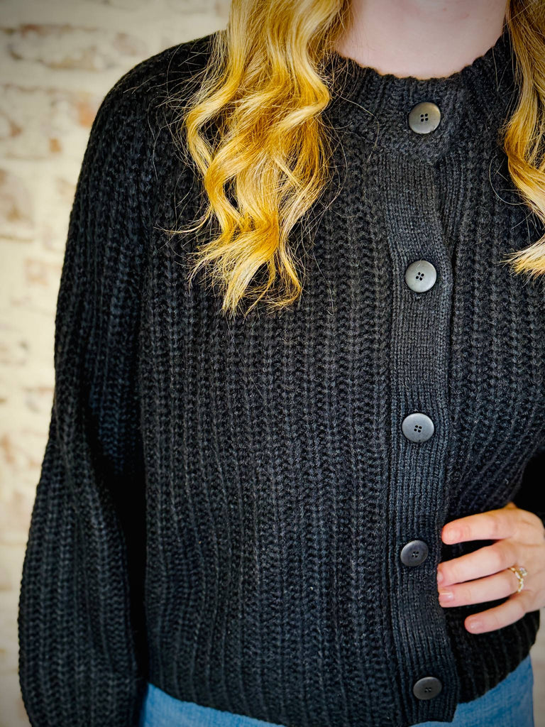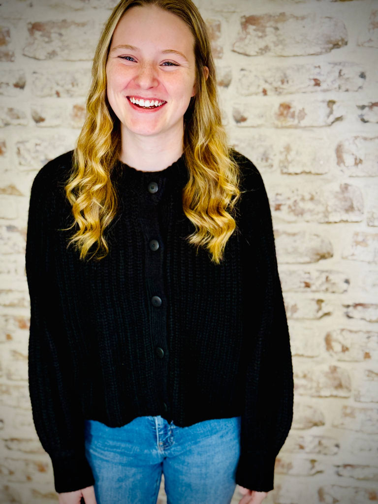 This black button up cardigan is sure to get a lot of use! With its high neck style and it sits right at the hip, it's on-trend and it's going to keep you warm and cozy!