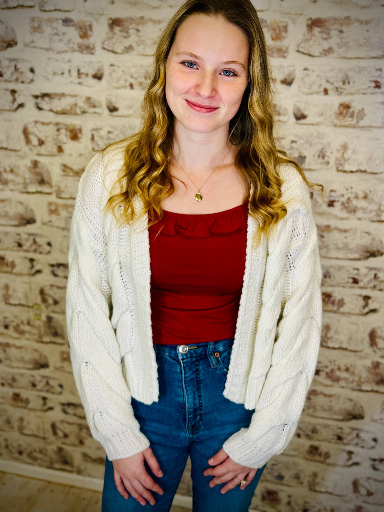 Wrap yourself in cozy charm with this Oversize Cable Knit White Cardigan. Its whip cream color brightens any outfit, while the open front and drop shoulders create a relaxed, effortlessly stylish look. The classic cable knit texture adds timeless warmth and a touch of playful flair, making it perfect for layering on cool days or breezy nights. Whether you're lounging at home or out with friends, this versatile cardigan brings comfort and casual cool to your wardrobe with every wear.