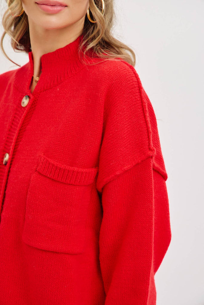 Festive red cardigan with a relaxed fit, mock collar, and oversized pockets. Button-down front and ribbed trim make it cozy and versatile for holiday style.